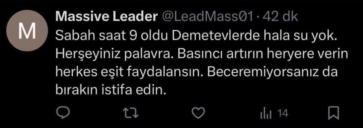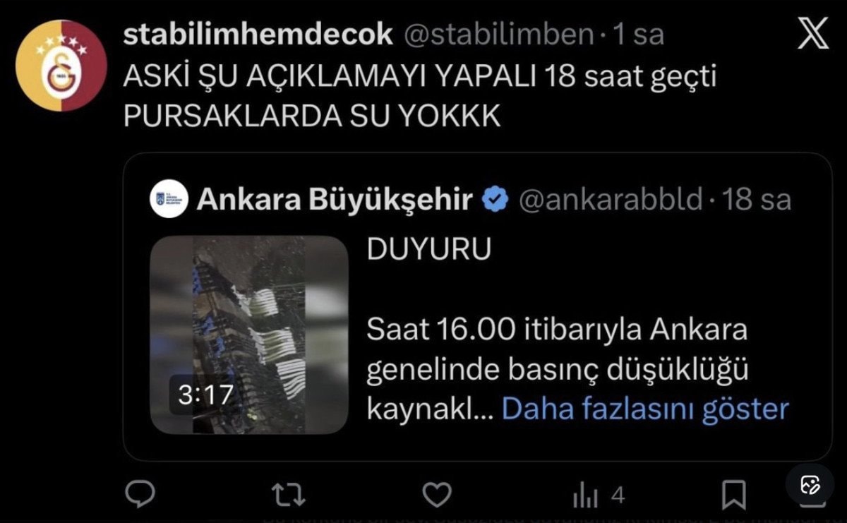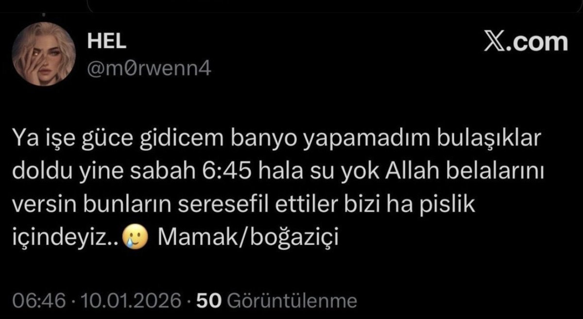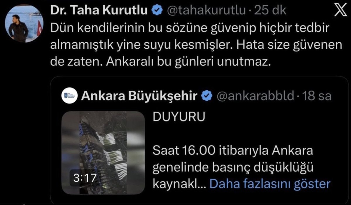 Yapılan paylaşımlarda, “Yaa bari 5 dk açın şu suları kombileri dolduralım hem susuz kaldık hem de donuyoruz”, “Sabah saat 9 oldu Demetevlerde hala su yok. Her şeyiniz palavra”, “Keçiören’den bildiriyorum yaklaşık 34 saattir suyumuz yok” gibi ifadeler yer aldı.