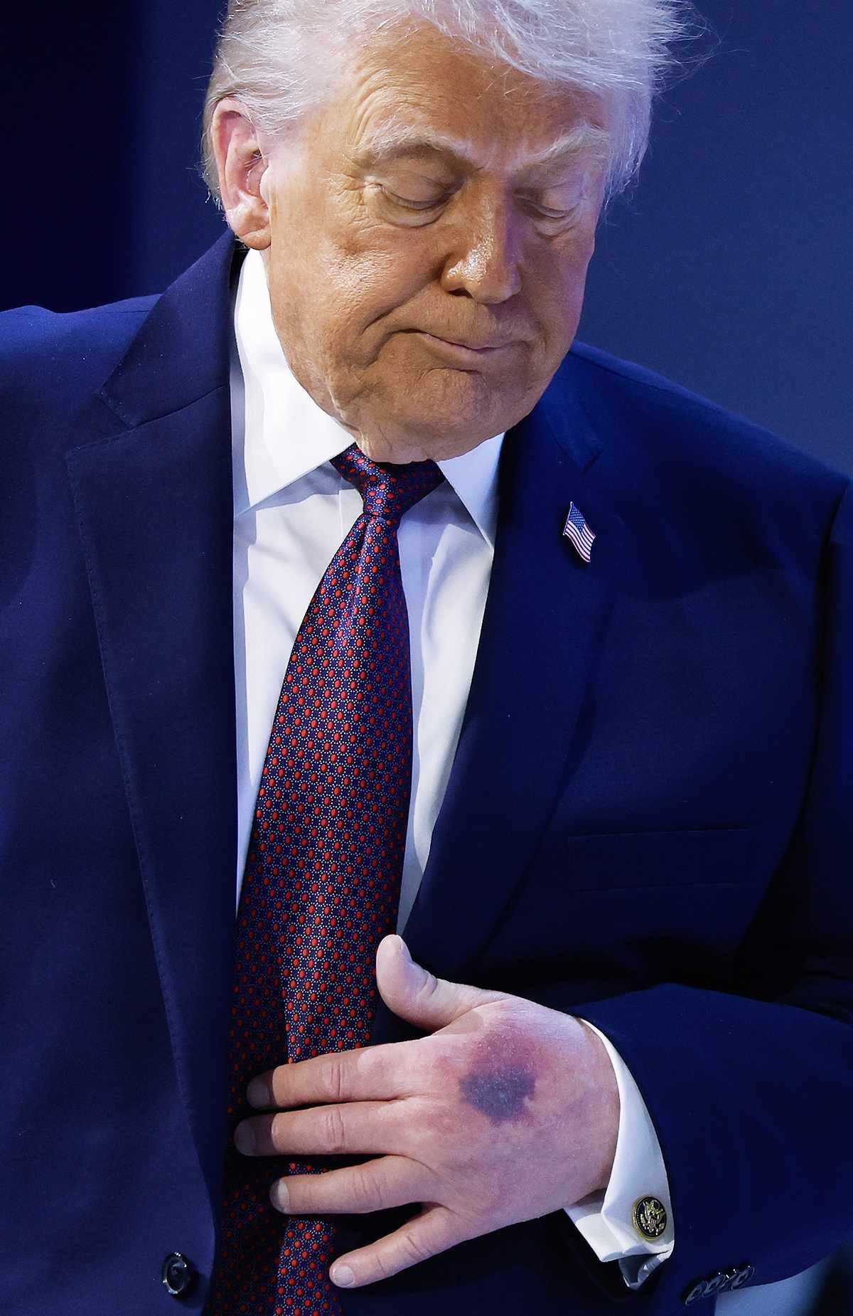 Törende Trump’ın sol elinde görülen morluk dikkatlerden kaçmadı.