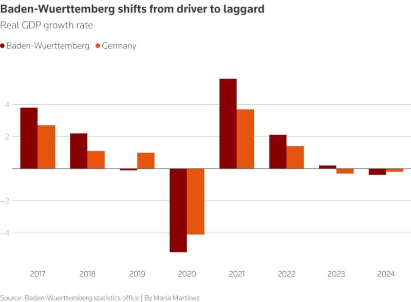 Rakamlara bakıldığında, 2024 yılında Almanya ekonomisi yüzde 0,2 oranında küçülürken Baden-Württemberg ekonomisinin yüzde 0,4 oranında daralması durumun ciddiyetini ortaya koyuyor.