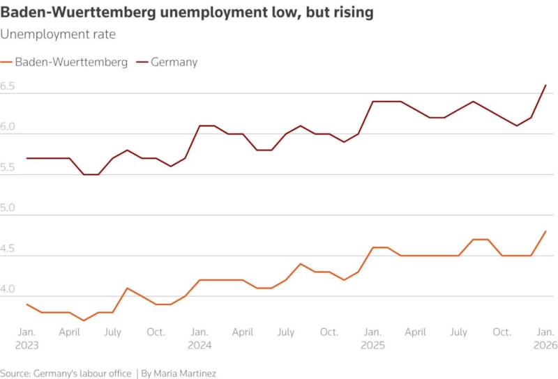 Grafik: Baden-Württemberg ile Almanya’nın 2023–2026 arasındaki işsizlik oranları.