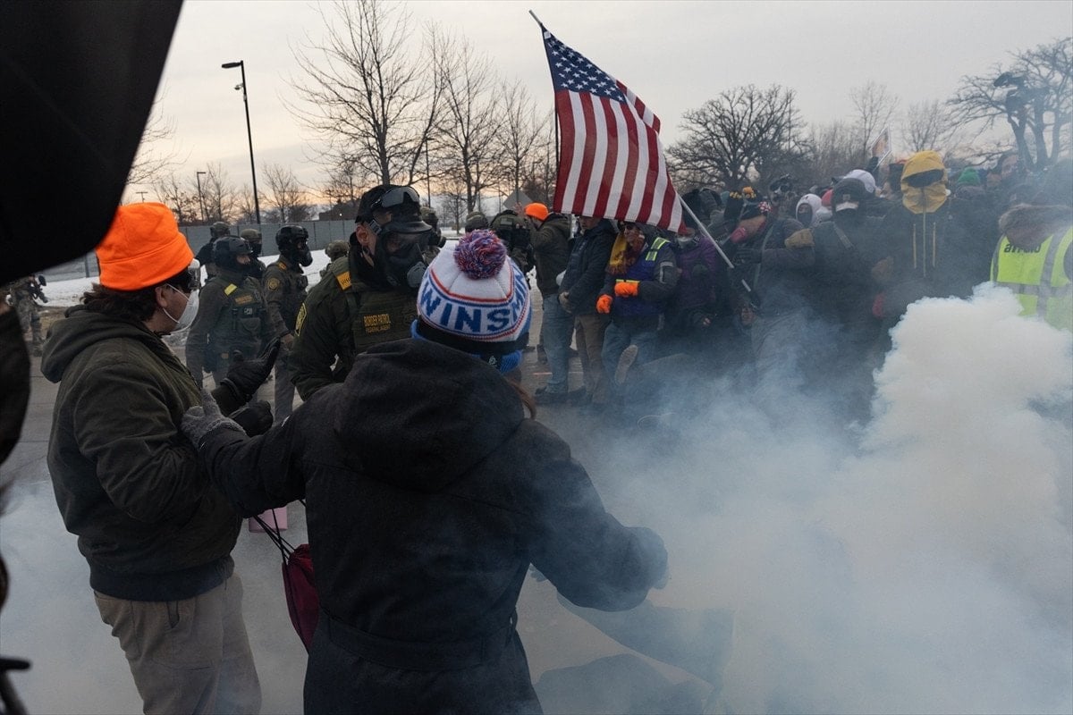 Düzenlenen protesto sırasında, federal ajanlara ait araçların tesisten ayrılmasını engellemeye çalışan göstericiler ile kolluk kuvvetleri arasında arbede yaşandı.