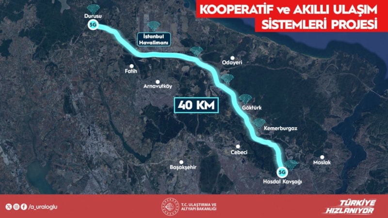 Ulaştırma ve Altyapı Bakanı Abdulkadir Uraloğlu, “Pilot olarak belirlenen İstanbul Hasdal Kavşağı ile İstanbul Havalimanı arasındaki 40 kilometrelik güzergahta 19 farklı noktada yapılan kurulumla yolun tamamında 5G altyapısını tamamladık. Kurulum çalışmalarını tamamladığımız bu pilot koridorda artık test süreçlerine geçiyoruz. Sahada gerçek zamanlı veri akışını izleyerek sistemin tüm bileşenlerini eş zamanlı olarak deneyeceğiz.” dedi.