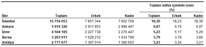 İstanbul’un nüfusu, bir önceki yıla göre 52 bin 451 kişi artarak 15 milyon 754 bin 53 kişi oldu. Türkiye nüfusunun %18,3’ünün ikamet ettiği İstanbul’u, 5 milyon 910 bin 320 kişi ile Ankara, 4 milyon 504 bin 185 kişi ile İzmir, 3 milyon 263 bin 11 kişi ile Bursa ve 2 milyon 777 bin 677 kişi ile Antalya izledi.