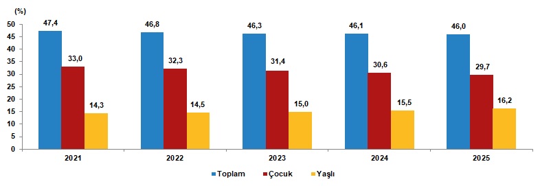 Çalışma çağındaki birey başına düşen çocuk ve yaşlı birey sayısını gösteren toplam yaş bağımlılık oranı, 2024 yılında %46,1 iken 2025 yılında %46’ya düştü. Çalışma çağındaki birey başına düşen çocuk sayısını ifade eden çocuk bağımlılık oranı, %30,6’dan, %29,7’ye gerilerken, çalışma çağındaki birey başına düşen yaşlı birey sayısını ölçen yaşlı bağımlılık oranı ise %15,5’ten %16,2’ye yükseldi. Diğer bir ifadeyle, Türkiye’de 2025 yılında, çalışma çağındaki her 100 kişi, 29,7 çocuğa ve 16,2 yaşlıya bakmaktadır.