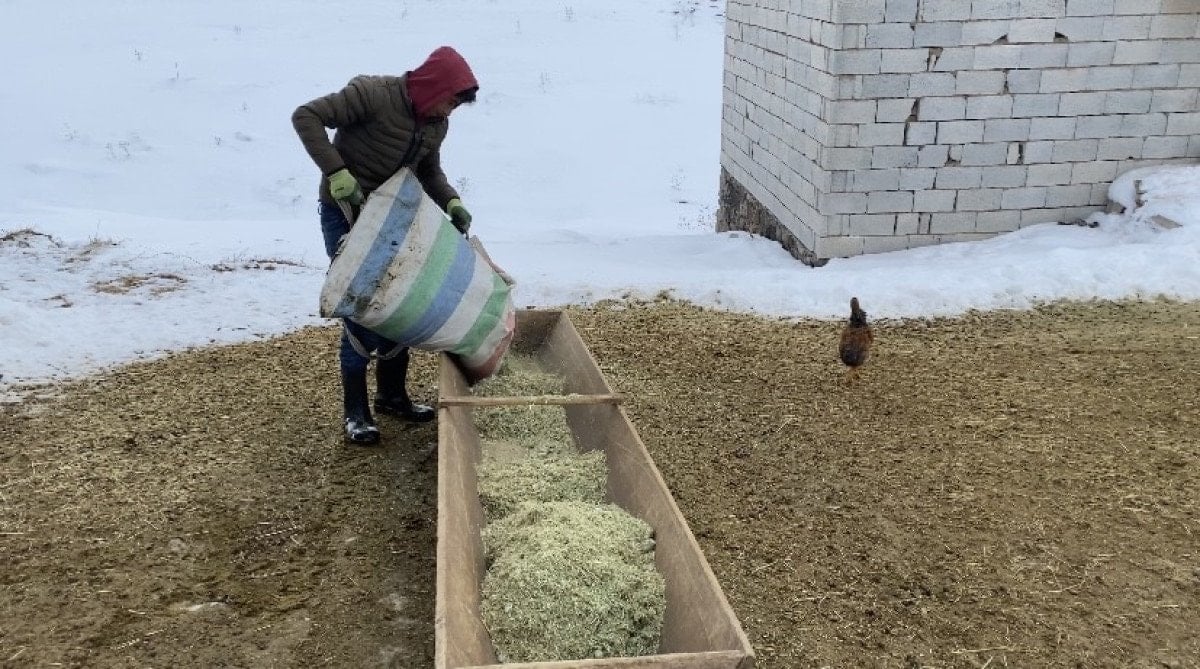 Bu yıl yoğun bir kar yağdığını ifade eden Menekşe Sevinç, “Koyunlara ot vermek için alanı kardan temizliyorum. Bu sene kar yoğun bir şekilde yağdı. Biraz fazla eziyet çektik ama değdi. Günde 2 kez hayvanları dışarı çıkartıp yem veriyoruz. Zor olsa da bunu yapmak zorundayız” dedi.