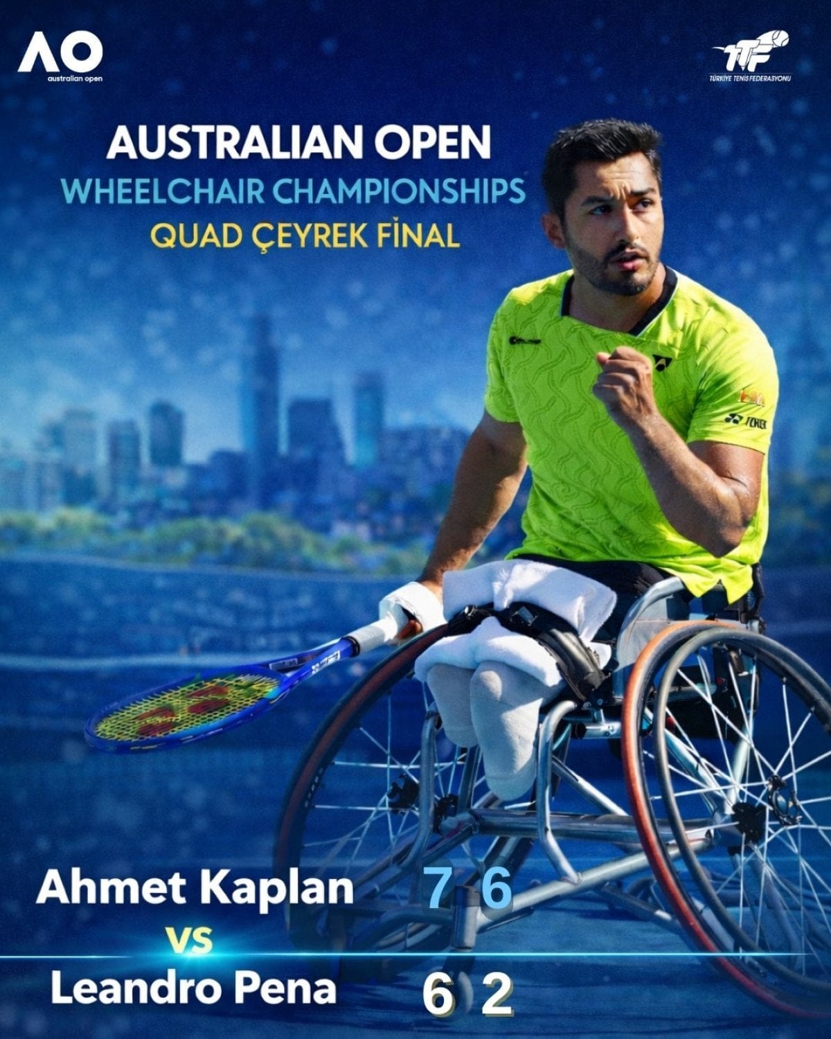 Dünya 4 numarası Ahmet Kaplan, Melbourne kentinde düzenlenen turnuvadaki quad tekerlekli sandalye çeyrek final maçında, Brezilyalı Leandro Pena ile karşılaştı.