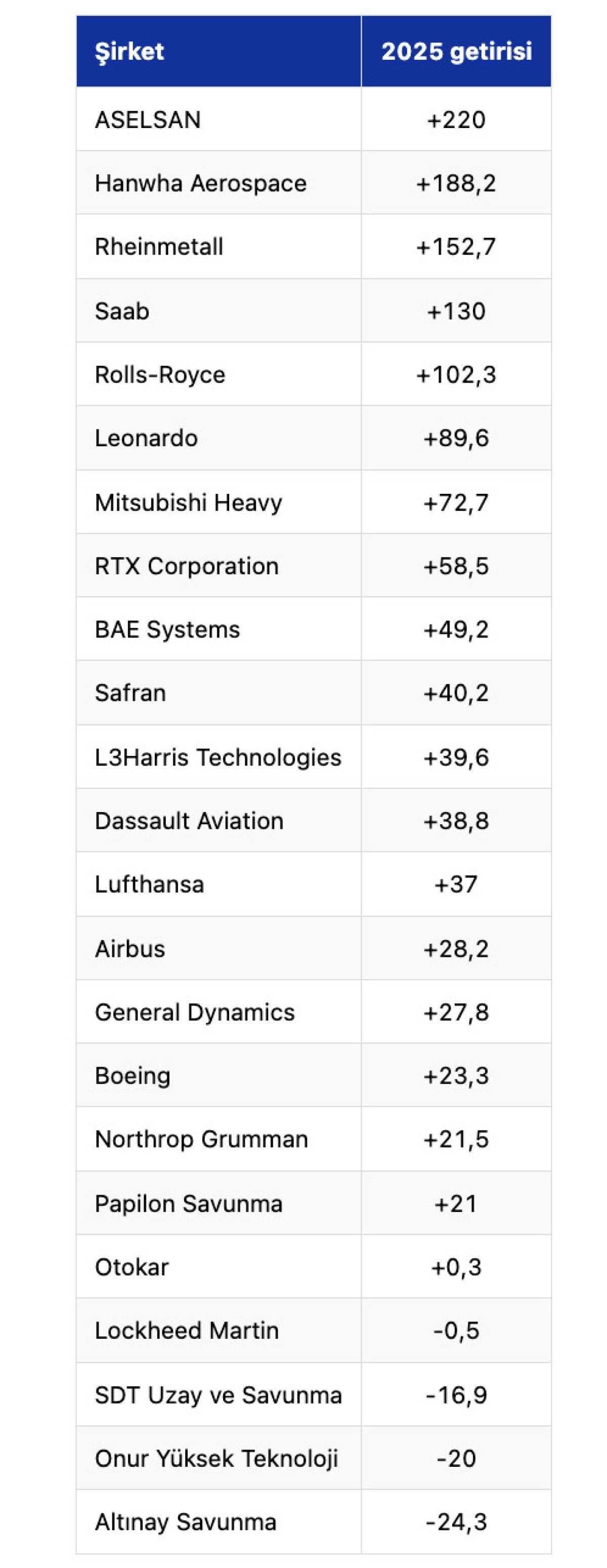 Yatırımcısına Güney Koreli Hanwha Aerospace yüzde 188,2, Alman Rheinmetall yüzde 152,7, İsveçli Saab yüzde 130, İngiliz Rolls-Royce yüzde 102,3, İtalyan Leonardo yüzde 89,6, Japon Mitsubishi Heavy yüzde 72,7, ABD’li RTX Corporation yüzde 58,5, İngiliz BAE Systems yüzde 49,2, Fransız Safran yüzde 40,2 kazandırdı.