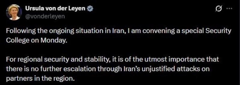 Kallas’ın ardından Ursula von der Leyen ve AB Konseyi Başkanı Antonio Costa da itidal çağrısında bulunan ortak mesaj yayımladı.
