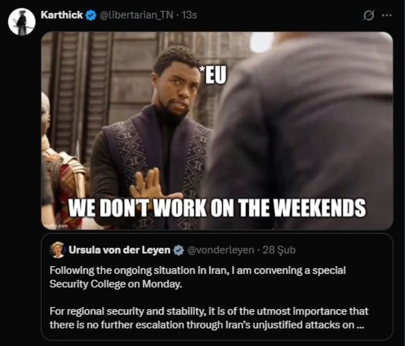 Saldırıların hemen ardından Avrupa Birliği (AB) kanadından gelen nispeten geç ve “gelişmeleri endişeyle izliyoruz” içerikli mesajlar, özellikle hafta sonuna denk gelmesi nedeniyle kullanıcılar tarafından alaycı paylaşımlarla gündeme taşındı.