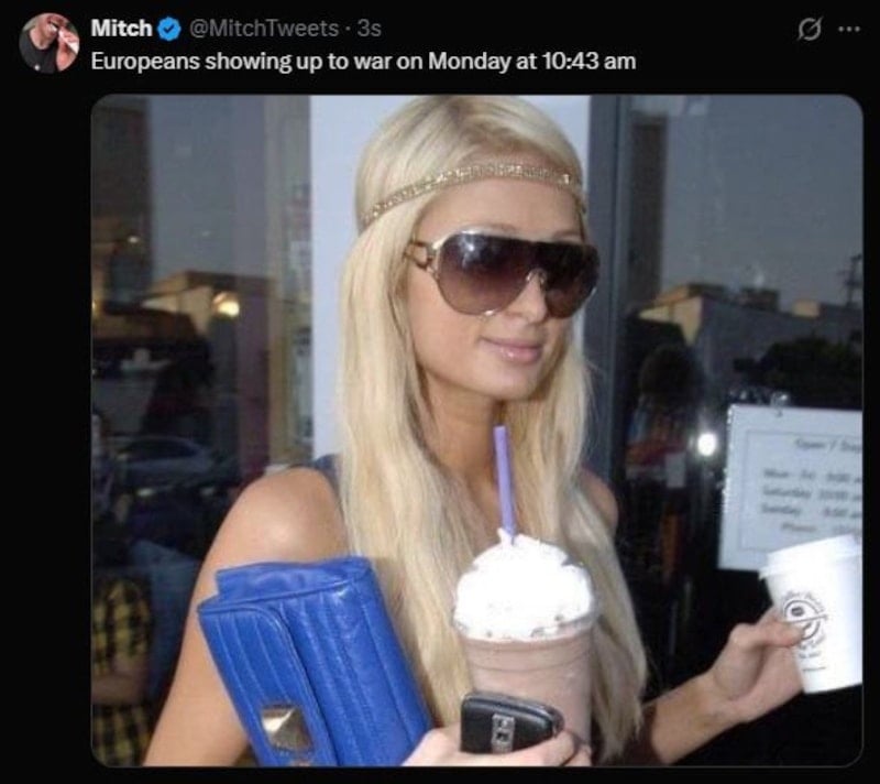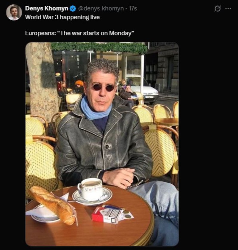 Güneşli havada dışarıda kahve içen bir kişinin fotoğrafı altına yapılan “Avrupalılar hafta sonunun tadını çıkarıyor ve Amerikan-İran savaşıyla ilgili gelişmeleri (2 Mart) pazartesiye erteliyor.” yorumu da dikkat çekti.