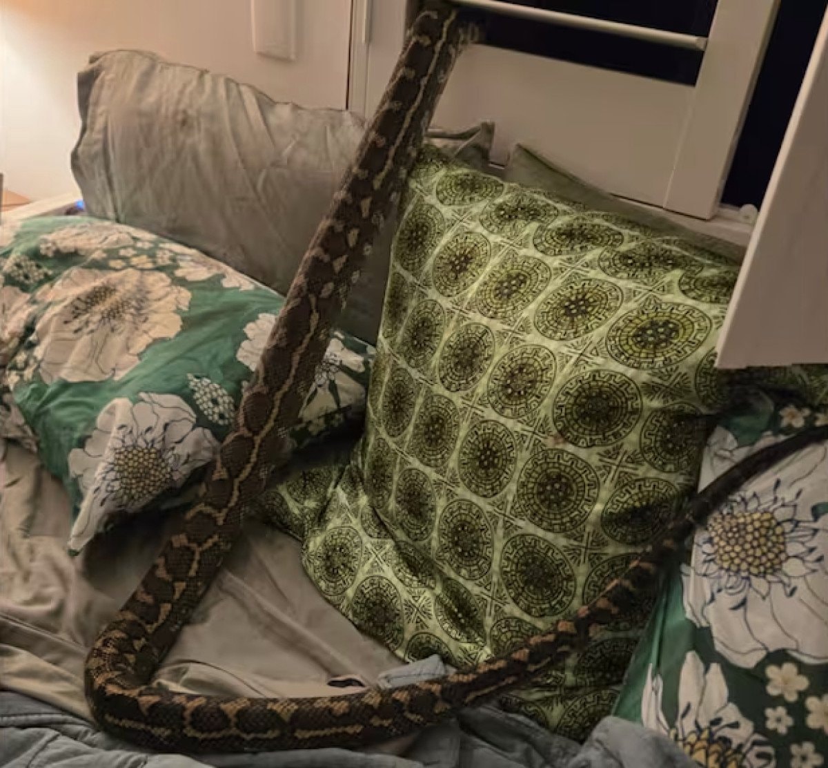 Kadın, örtünün altında kayarak hayvandan kurtulduktan sonra elinde mamayla pitonu dışarı yönlendirdi.