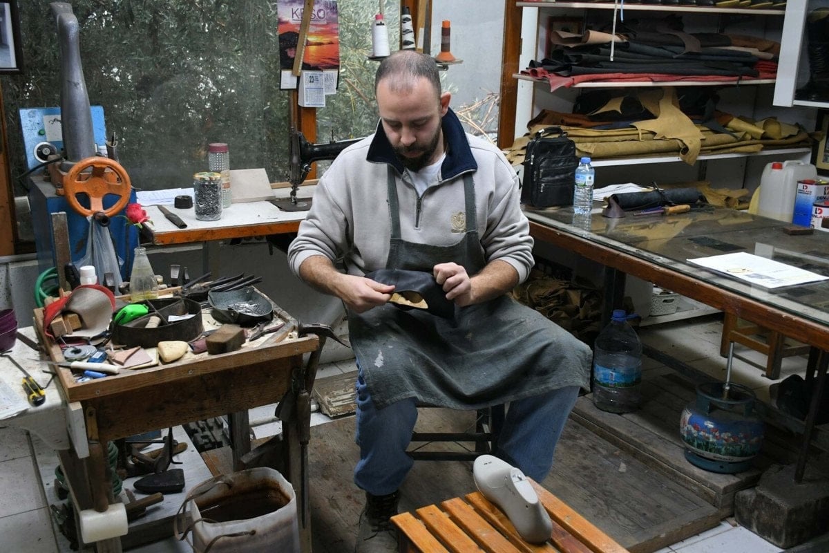 Omuz omuza veren baba-oğul, Bayraklıdede Mahallesi’ndeki 25 metrekarelik atölyede, körüklü çizme üretme geleneğini geleceğe taşımak için çalışıyor.