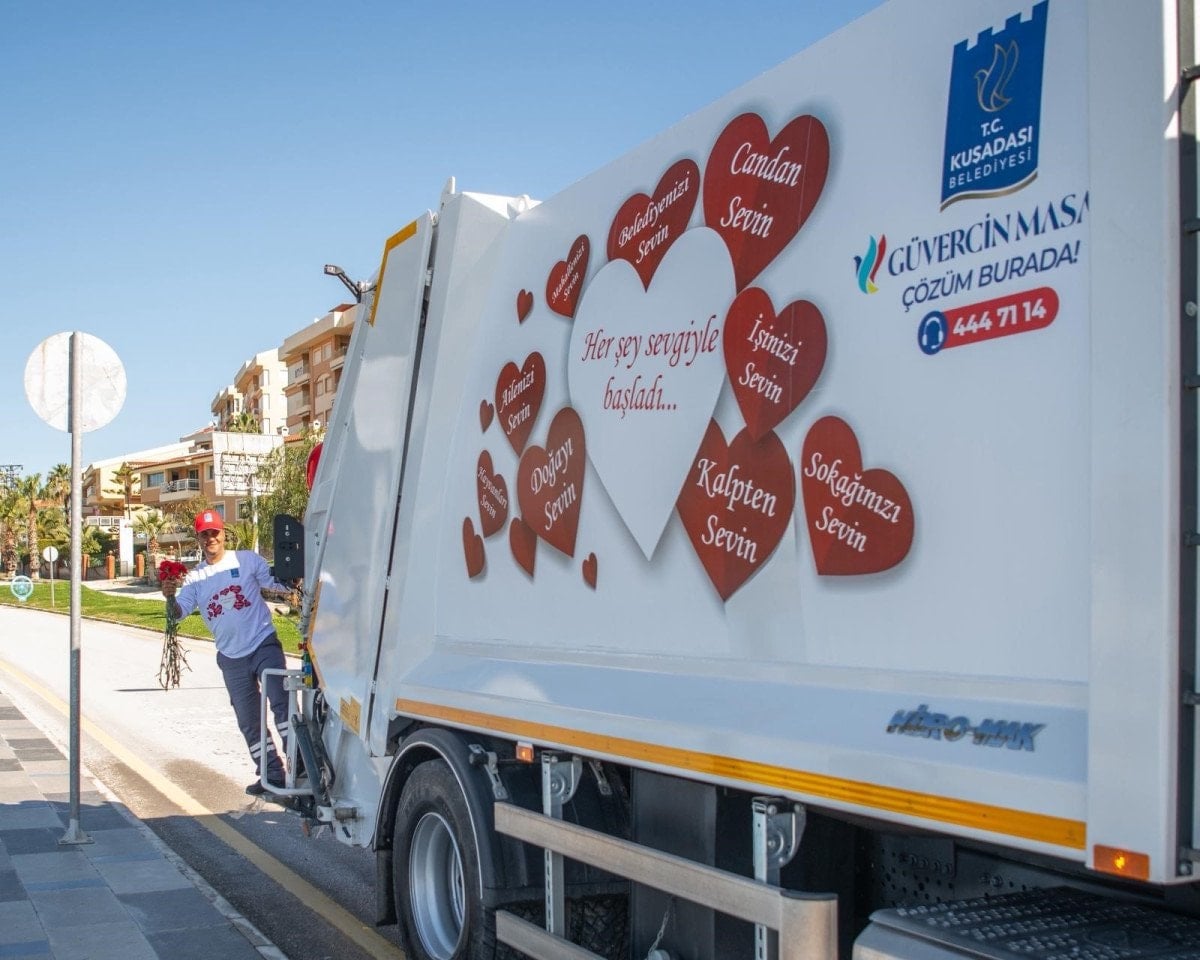 Aydın’ın Kuşadası ilçesinde çöp kamyonundan karanfil dağıtıldı