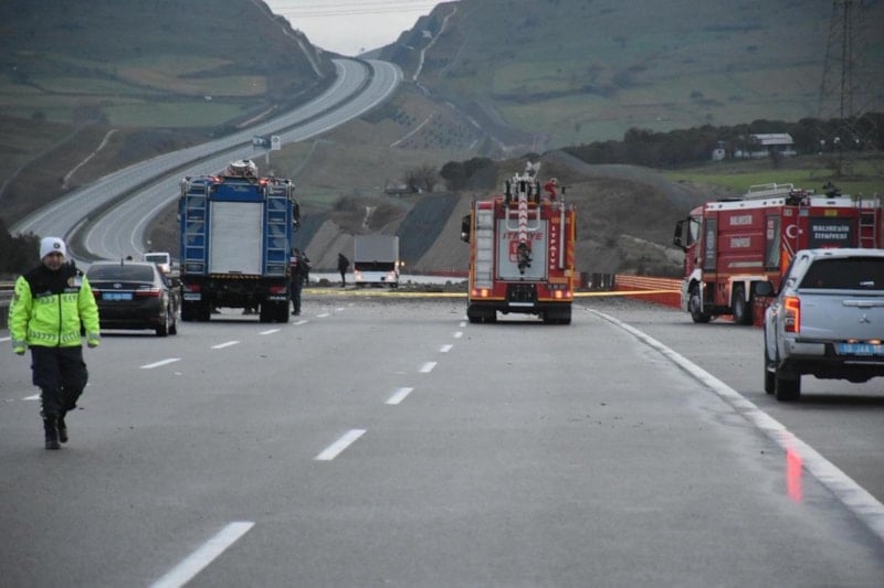 İstanbul-İzmir Otoyolu’nun Karesi mevkisinde yol kenarına düşen uçağın enkazı çevreye dağıldı.
