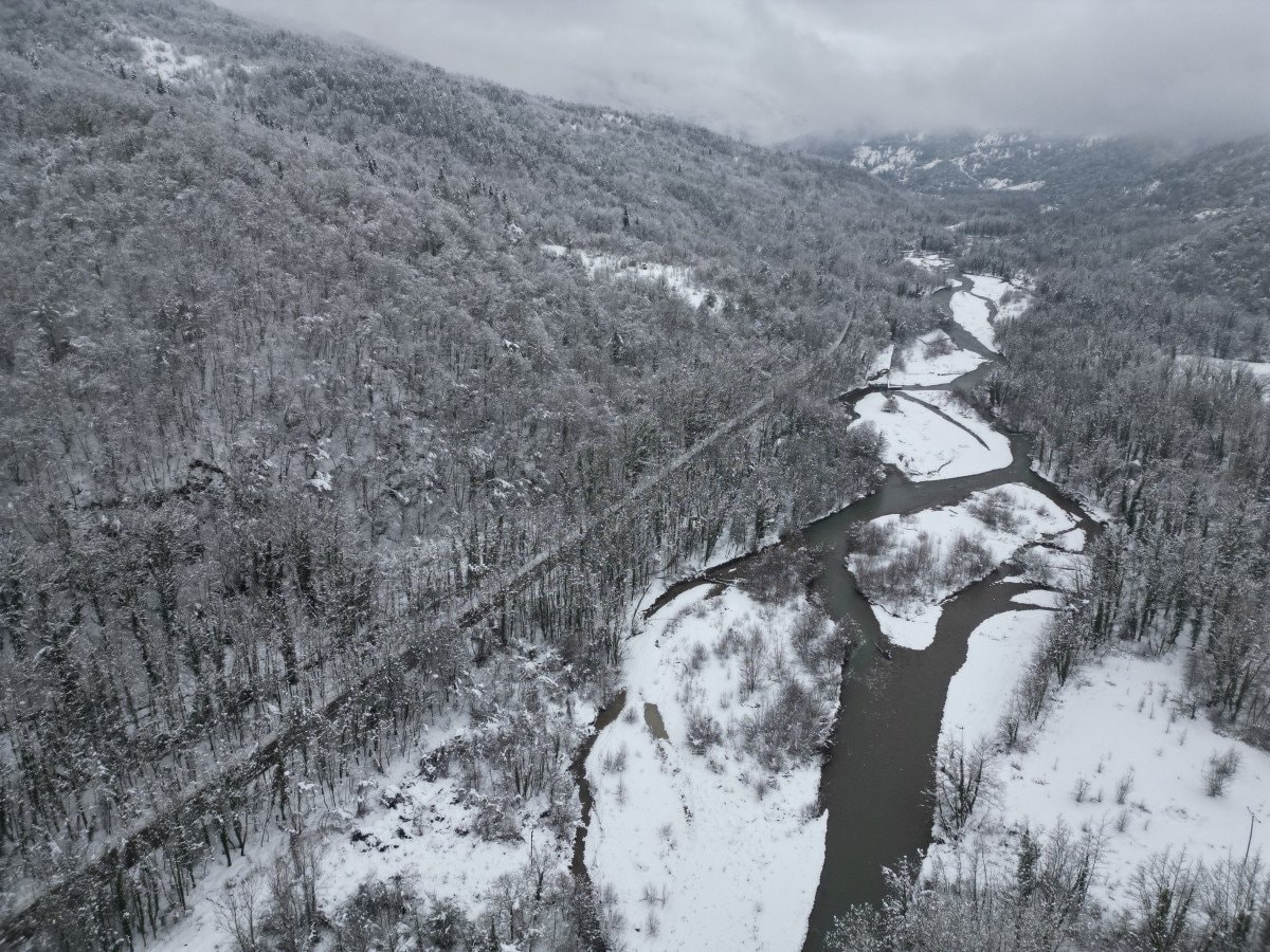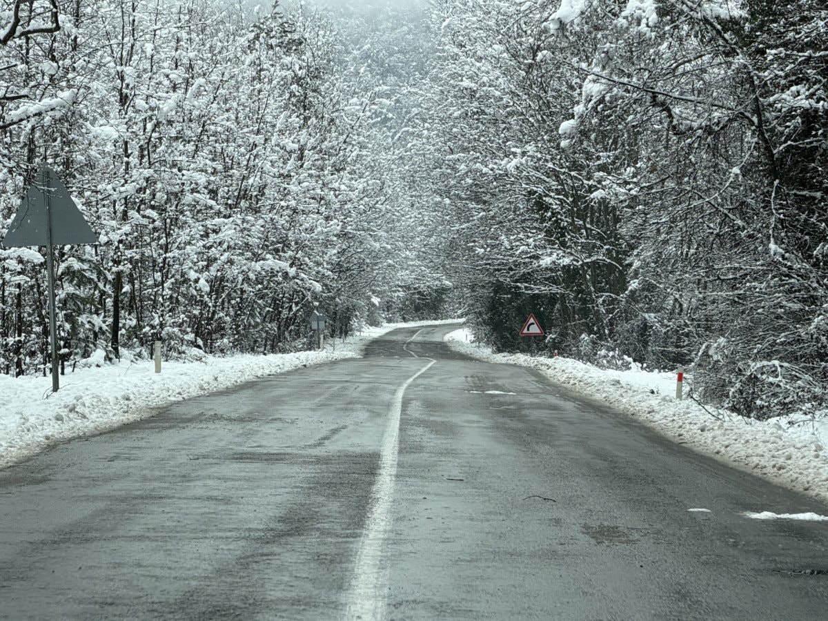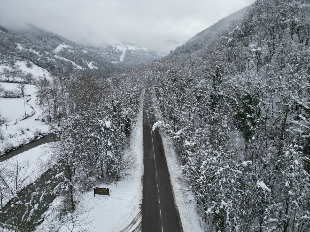 Sürücüler, karla kaplı ağaçların arasında keyifle yolculuk yaptı. Yolun karla kaplı eşsiz manzarası dron ile görüntülendi.