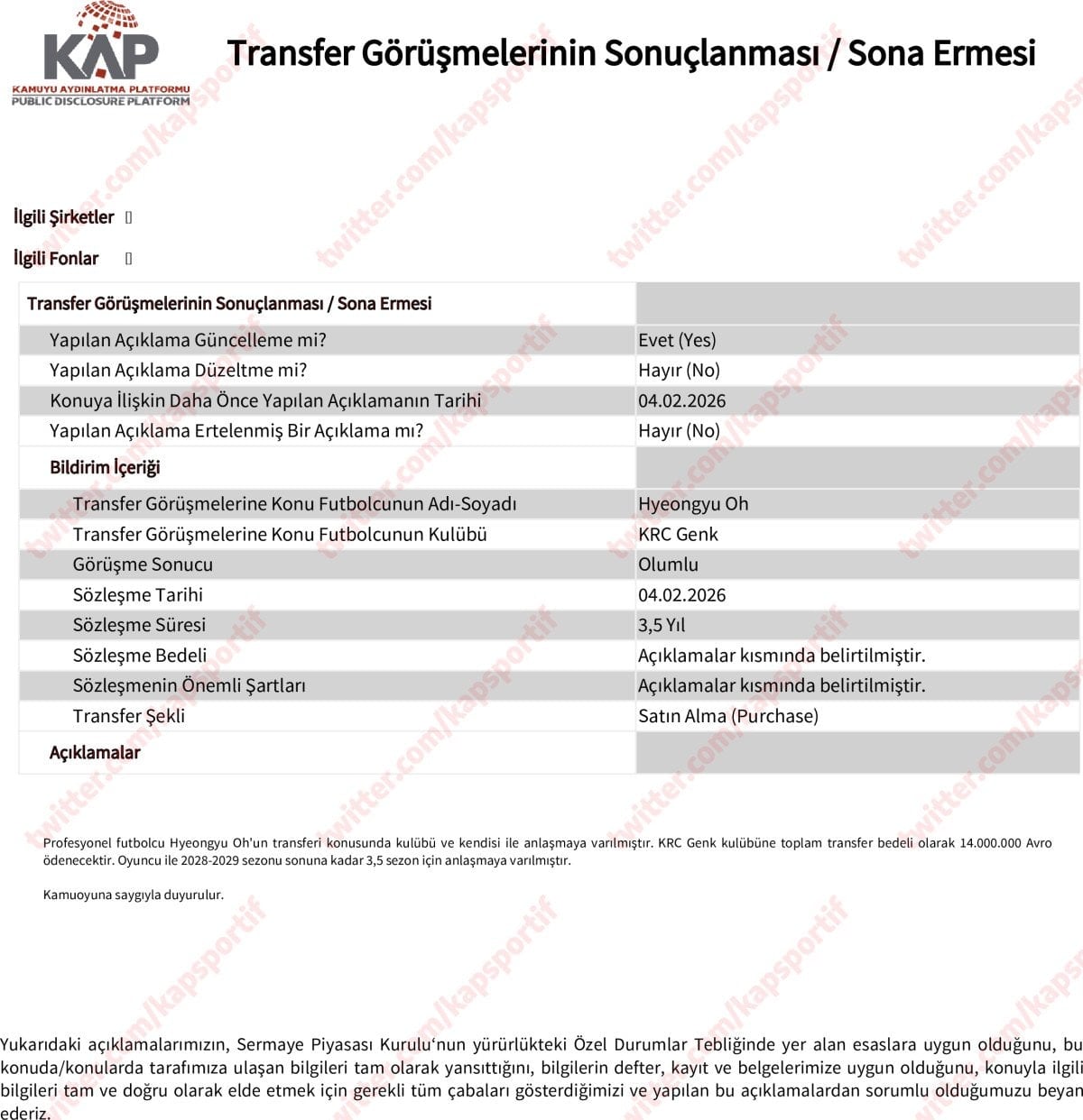 Profesyonel futbolcu Hyeongyu Oh’un transferi konusunda kulübü ve kendisi ile anlaşmaya varılmıştır. KRC Genk kulübüne toplam transfer bedeli olarak 14.000.000 Avro ödenecektir. Oyuncu ile 2028-2029 sezonu sonuna kadar 3,5 sezon için anlaşmaya varılmıştır.