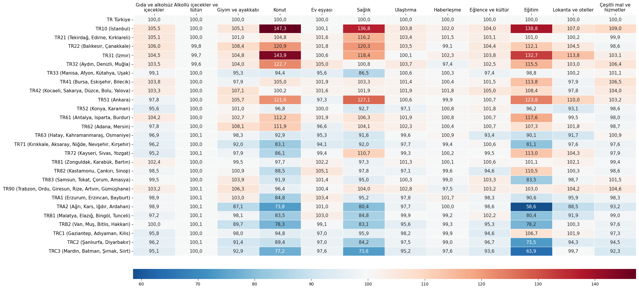 İstatistiki Bölge Birimleri Sınıflaması (İBBS) 2. Düzey detayında üretilen endeksler ile farklı bölgelerdeki fiyat düzeylerinin karşılaştırılmasına imkan sağlanmıştır. Bir bölgenin fiyat düzeyi endeksi, 100’den büyük ise bu bölge Türkiye ortalamasına göre “pahalı”, 100’den küçük ise bu bölge Türkiye ortalamasına göre “ucuz” olarak ifade edilmektedir.