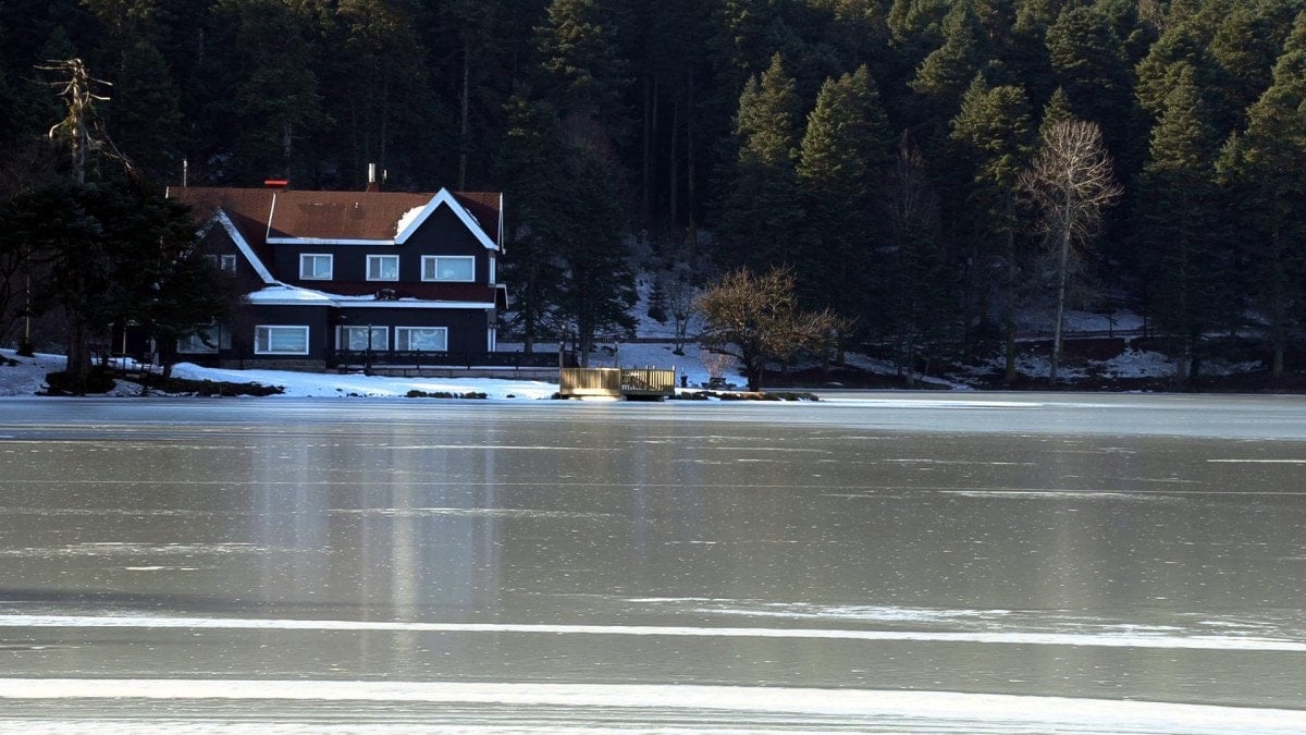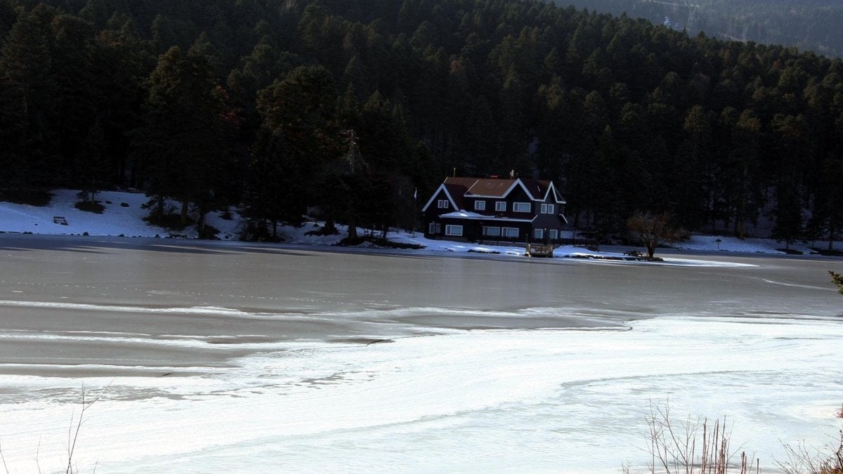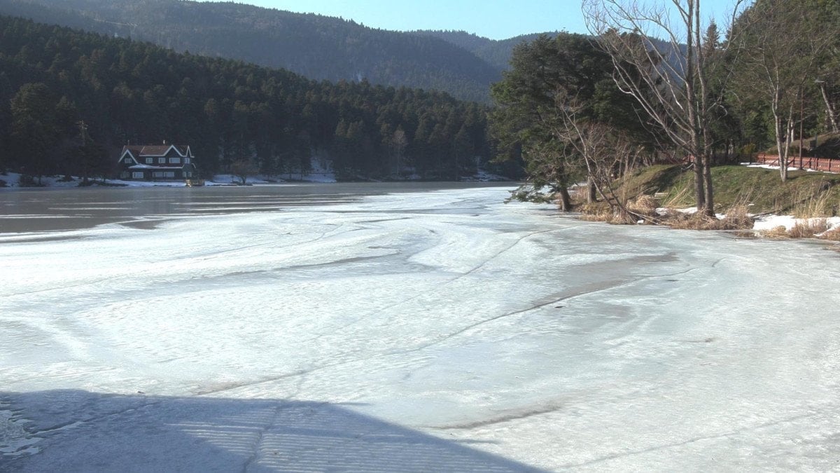 Eşsiz manzarasıyla dikkat çeken 1217 metre rakımlı tabiat parkındaki 4,5 hektar büyüklüğündeki gölün yüzeyi tamamen buzla kaplandı.
