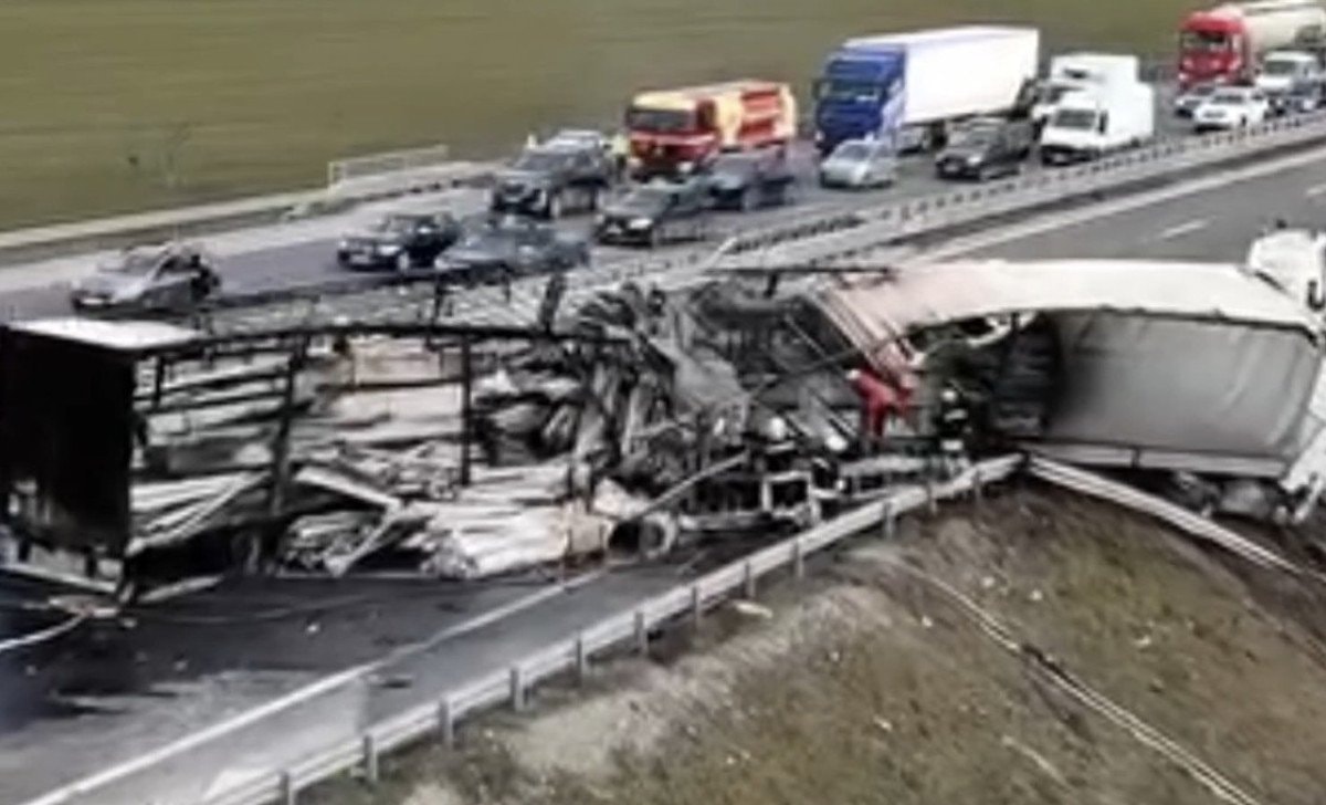 Bulgaristan’ın başkenti Sofya’daki otoyolda arıza nedeniyle yol kenarında duran tıra arkadan gelen başka bir tır çarptı.