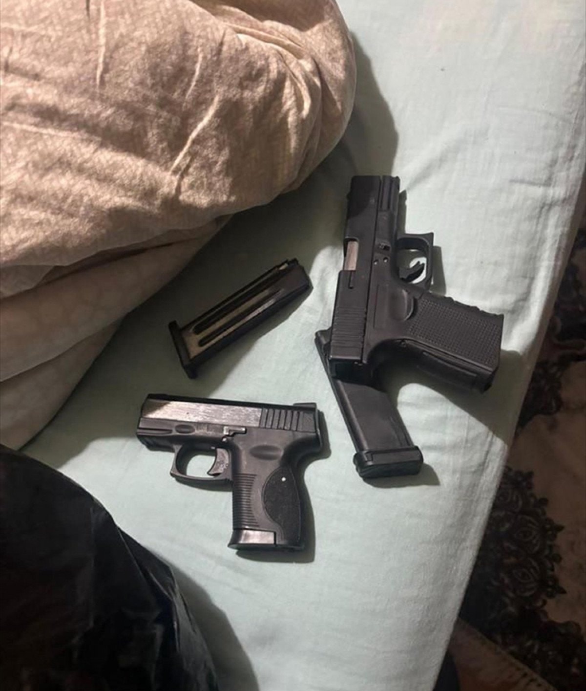 İkamette yapılan aramada 2 ruhsatsız tabanca ve boş şarjörler, 1 litre 730 mililitre sıvı sentetik uyuşturucu, çeşitli miktarda uyuşturucu madde, hassas terazi, 96 bin 600 lira, 807 dolar ve 170 euro ele geçirildi.