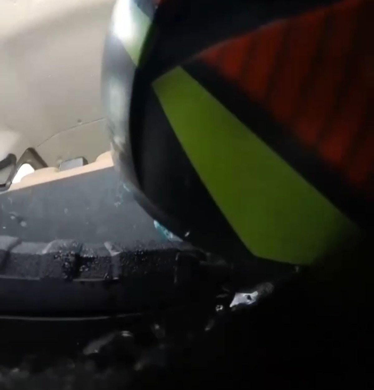 Belden yukarısı araç içinde kalan sürücünün kolları kırılırken, kaza kask kamerasına yansıdı.