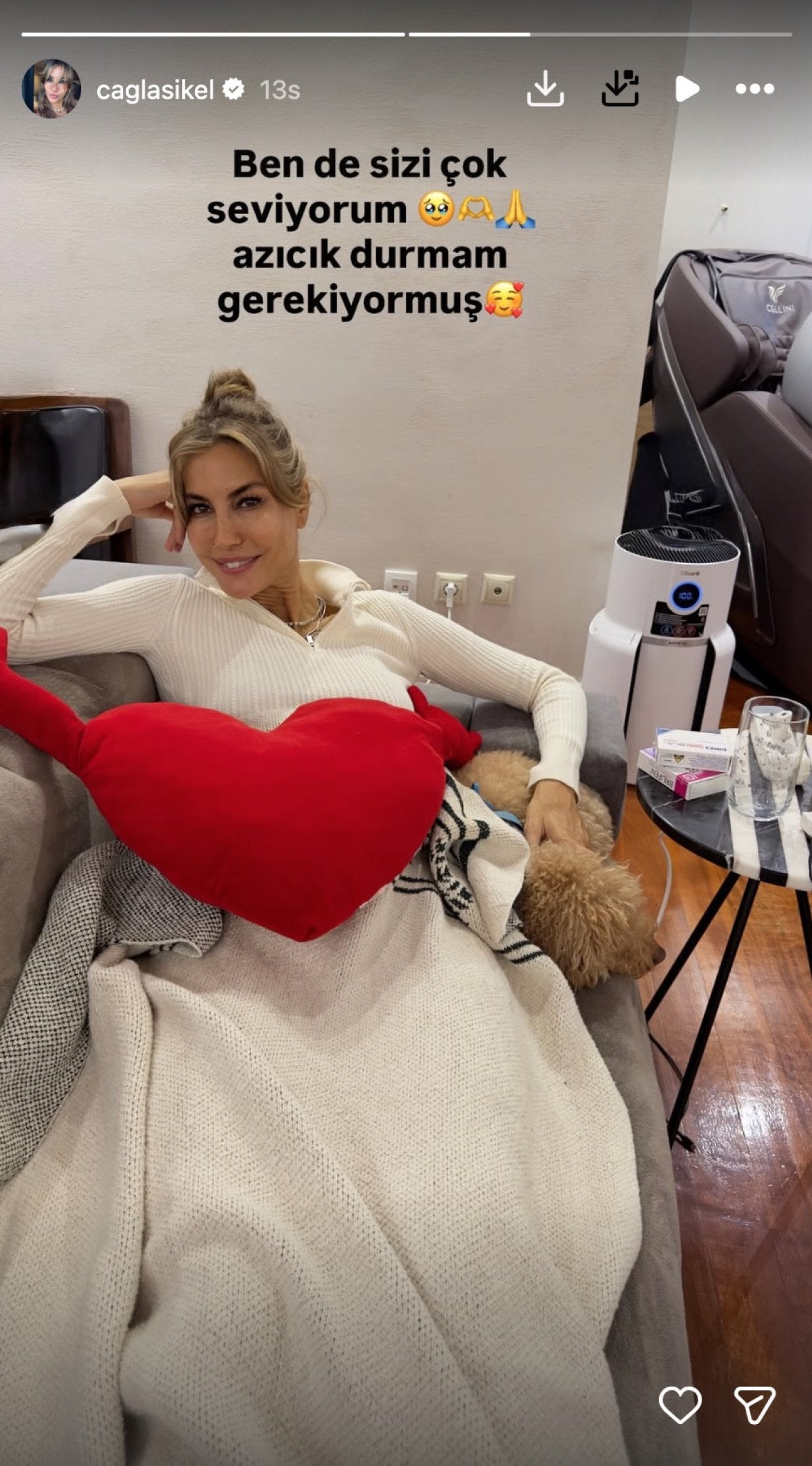 Sosyal medya hesabından bir açıklama yapan Çağla Şıkel rahatsızlığıyla ilgili bilgi vererek, “Ben de sizi çok seviyorum azıcık durmam gerekiyormuş” ifadelerini kullandı.