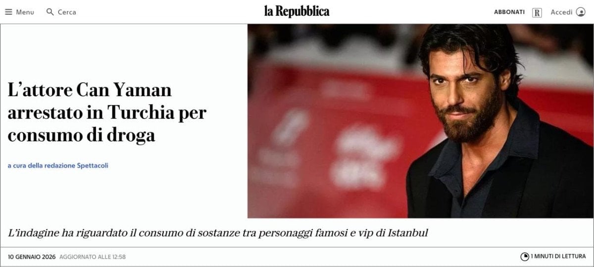 La Repubblica, “Oyuncu Can Yaman Türkiye’de uyuşturucu kullanımı nedeniyle gözaltına alındı” başlığıyla yayınladığı haberinde “İtalya’da bazı başarılı televizyon dizilerinde (Che Dio ci aiuti 6, Viola come il mare, Sandokan) başrol oynaması ve İtalyanca diline olan derin bilgisiyle (İstanbul’daki İtalyan lisesinde eğitim görmüştü) çok popüler olan Yaman, oyuncu Selen Görgüzel de dahil olmak üzere 6 kişiyle birlikte gözaltına alındı.” ifadelerine yer verdi.