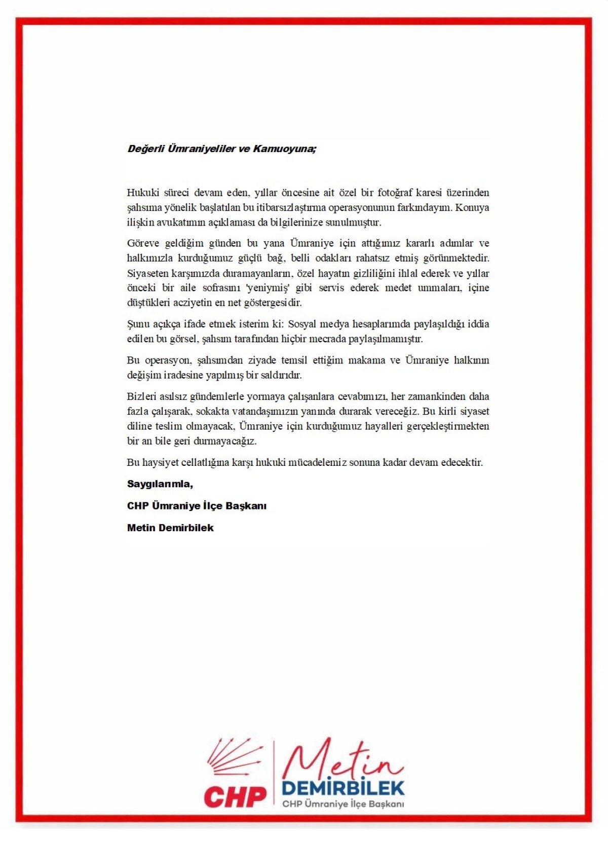 Fotoğrafın yayılmasının ardından Metin Demirbilek, sosyal medya hesabından yazılı bir açıklama yaptı. Görüntünün yıllar öncesine ait özel bir kare olduğunu savunan Demirbilek, hakkında “itibarsızlaştırma operasyonu” yürütüldüğünü ileri sürdü.