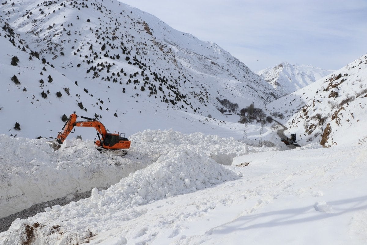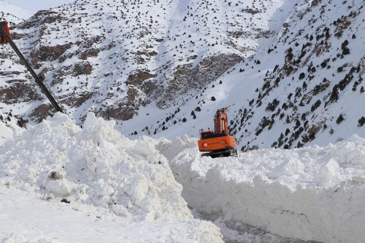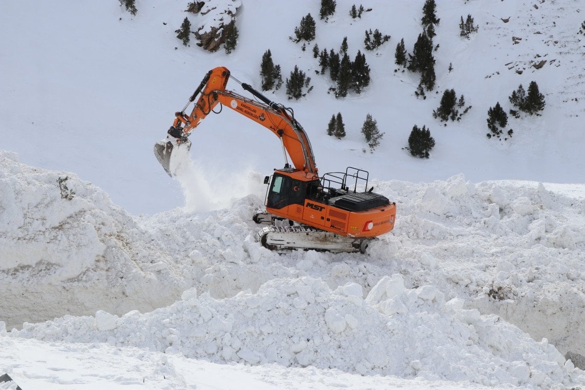 Çalışmaların devam ettiği bölgede iş makinelerinin, yer yer 5 metre yükseklikteki kar kütlelerinin arasında kaybolduğu görüldü.