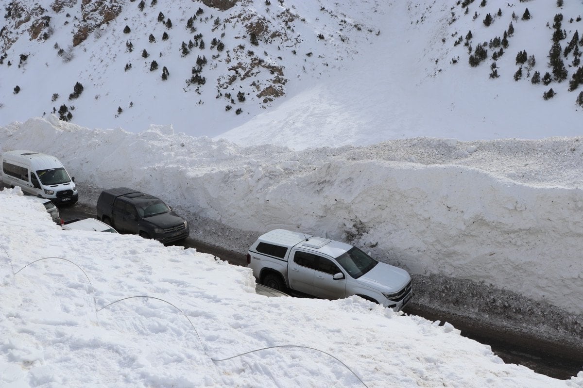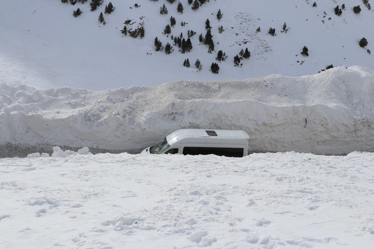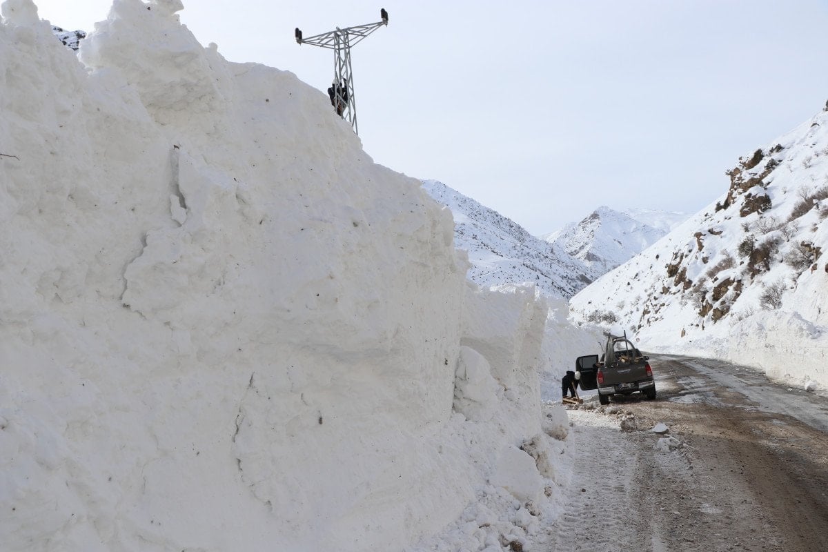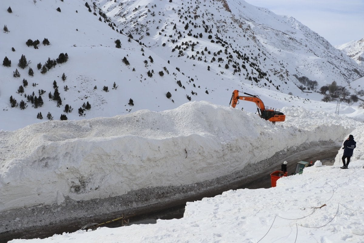 Çalışmaların devam ettiği bölgede iş makinelerinin, yer yer 5 metre yükseklikteki kar kütlelerinin arasında kaybolduğu görüldü.