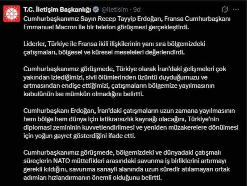 Türkiye Cumhuriyeti İletişim Başkanlığı tarafından yapılan açıklamaya göre, Cumhurbaşkanı Erdoğan ile Fransa Cumhurbaşkanı Macron’un telefon görüşmesinde iki ülke ilişkileri ile bölgedeki güvenlik gelişmeleri değerlendirildi.