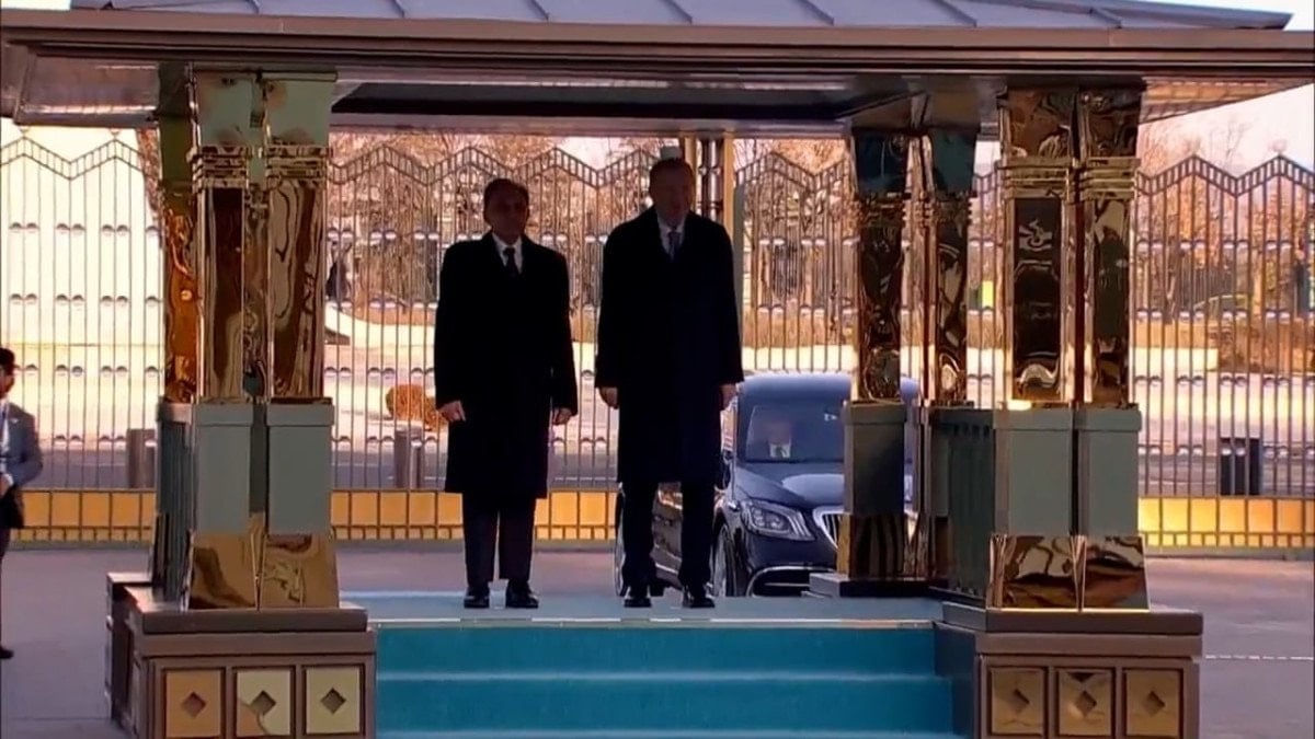 Cumhurbaşkanı Erdoğan ve İbrahim’in tören alanındaki yerlerini almalarının ardından 21 pare top atışı eşliğinde iki ülkenin milli marşları çalındı.