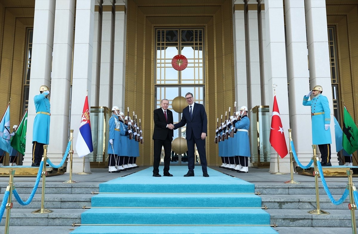 Sırbistan Cumhurbaşkanı Aleksandar Vucic, Ankara’daki temasları kapsamında Cumhurbaşkanlığı Külliyesi’nde düzenlenen resmi törenle karşılandı. Törenin ardından Erdoğan ve Vucic baş başa görüşmeye geçti.