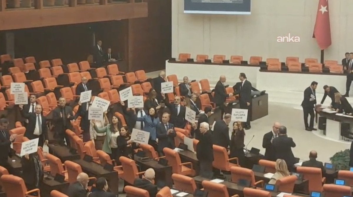 Oturdukları sıralara “Halep’te katliama hayır” yazılı dövizler koyan milletvekilleri, alkışlarla protesto etti, elleriyle sıralara vurarak tepki gösterdi.