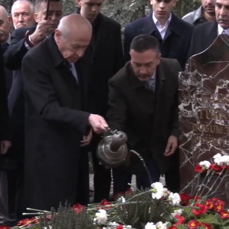 Bayramı Ankara’da geçiren Bahçeli, Türkeş’in mezarına karanfil bıraktı ve çiçekleri suladı.