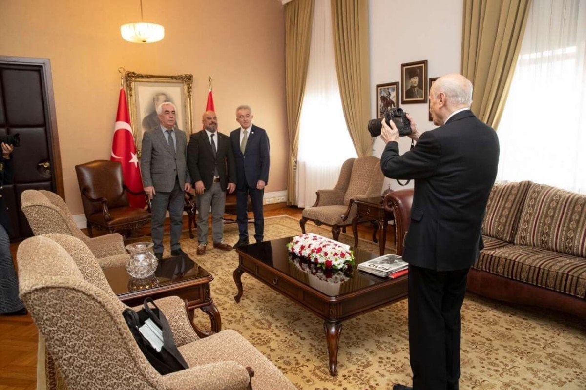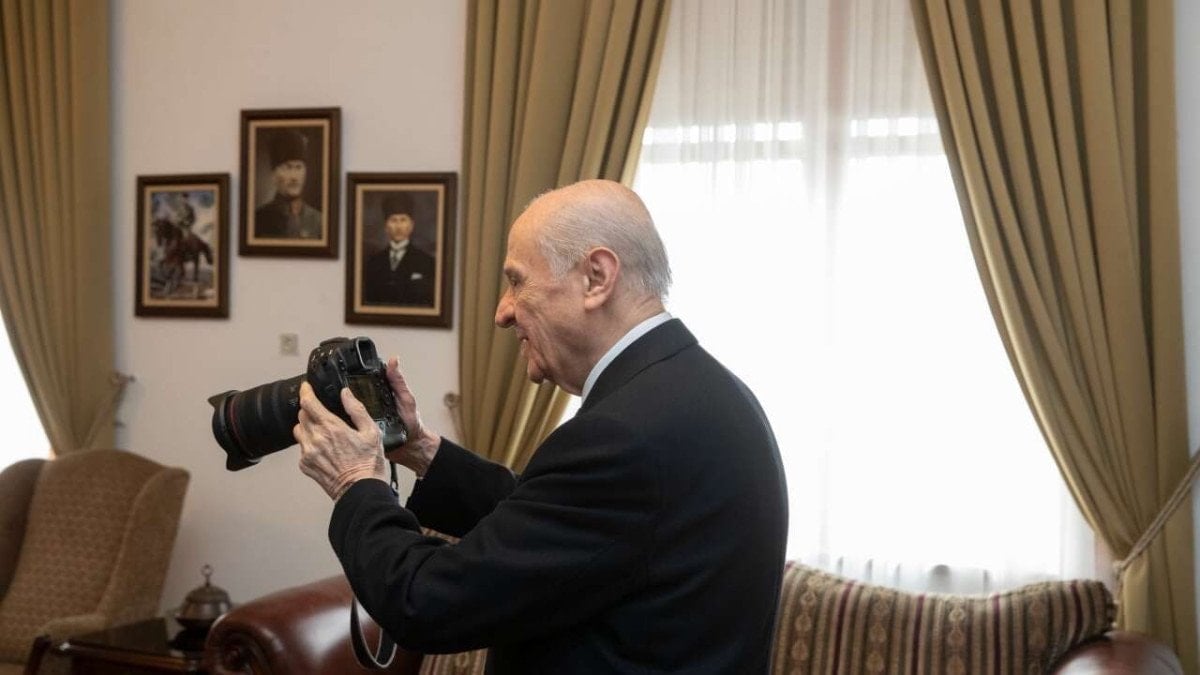 Öte yandan görüşmeye ilişkin paylaşılan fotoğraflarda Bahçeli’nin fotoğraf makinesini eline alarak heyetin fotoğrafını çektiği görüldü.