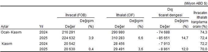 Ocak-Kasım döneminde dış ticaret açığı %14,7 artarak 74 milyar 688 milyon dolardan, 85 milyar 651 milyon dolara yükseldi. İhracatın ithalatı karşılama oranı 2024 Ocak-Kasım döneminde %74,3 iken, 2025 yılının aynı döneminde %72,4’e geriledi.