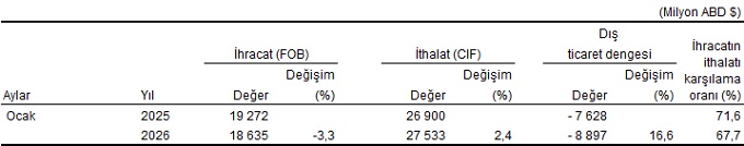 Özel ticaret sistemine göre, 2026 yılı Ocak ayında, ihracat bir önceki yılın aynı ayına göre %3,3 azalarak 18 milyar 635 milyon dolar, ithalat %2,4 artarak 27 milyar 533 milyon dolar olarak gerçekleşti.