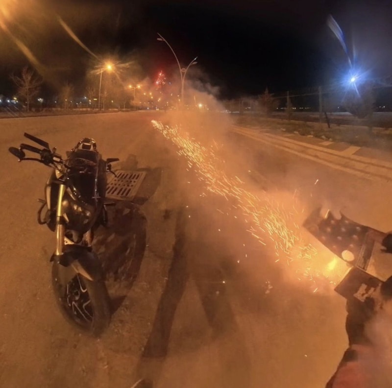 Sürücünün paylaştığı görüntülerde havai fişeğin ateşlenmesiyle gençlerin panikle kaçıştığı, ardından yapılan şakadan hoşlanmayan bir kişinin motosikletliyi kovaladığı görüldü.