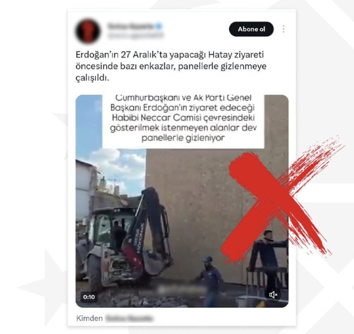 “Bazı sosyal medya hesaplarında yer alan, Cumhurbaşkanımız Sayın Recep Tayyip Erdoğan’ın 27 Aralık’ta gerçekleştireceği Hatay ziyareti öncesinde enkaz alanlarının panellerle gizlendiği iddiası manipülasyon içermektedir.”