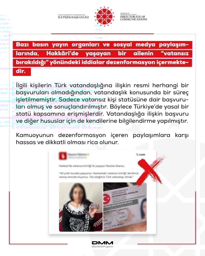 Cumhurbaşkanlığı İletişim Başkanlığı Dezenformasyonla Mücadele Merkezi, bazı basın yayın organları ve sosyal medya hesaplarında yer alan “aile vatansız bırakıldı” iddialarının dezenformasyon içerdiğini bildirdi.