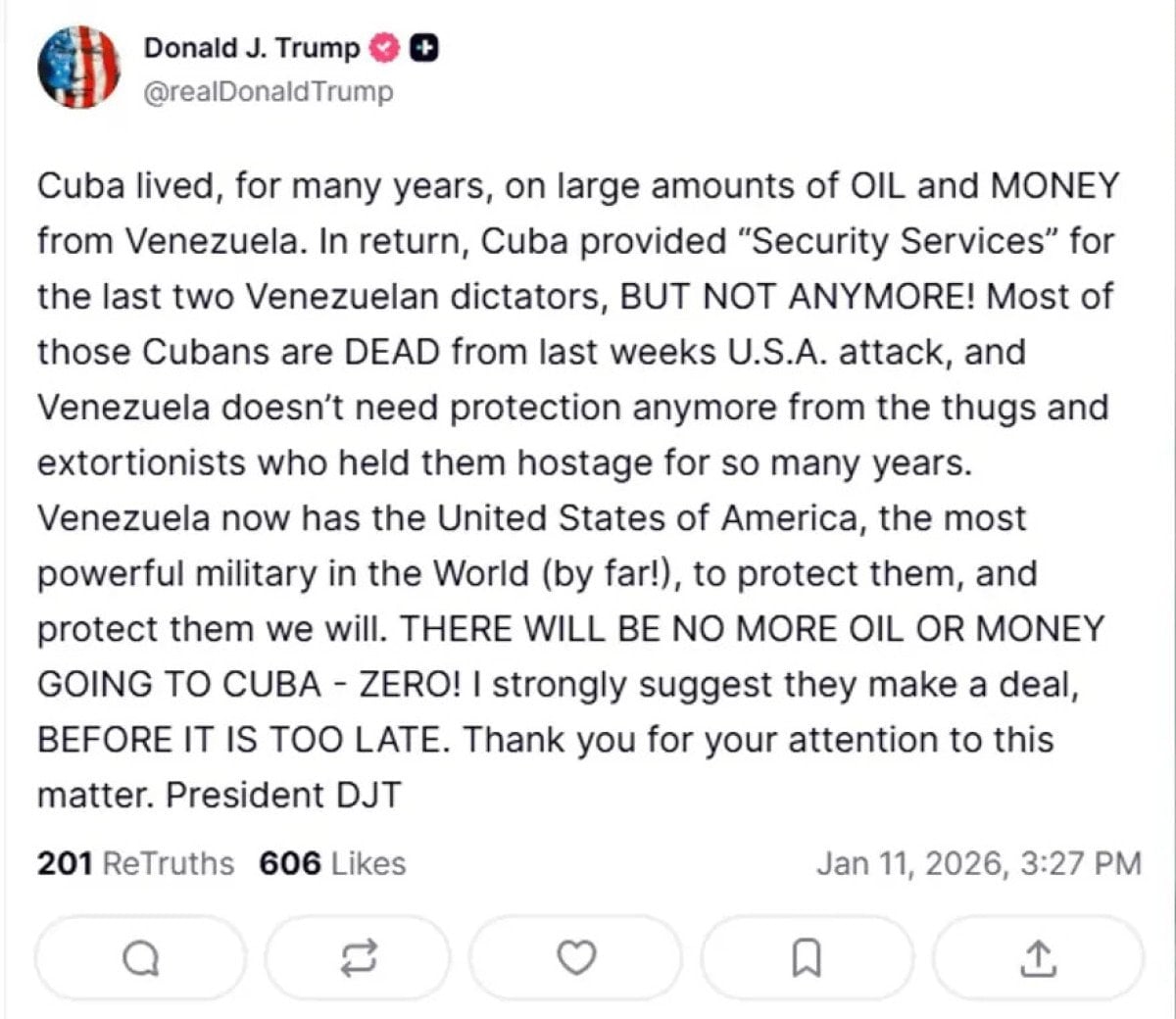 Kendi sosyal medya platformu Truth’ta bir paylaşım yapan Trump, Küba’yı açık açık tehdit etti.