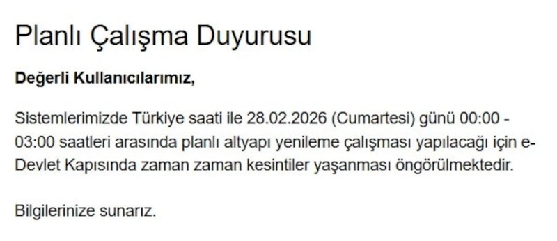 “Sistemlerimizde Türkiye saati ile 28.02.2026 (Cumartesi) günü 00:00 – 03:00 saatleri arasında planlı altyapı yenileme çalışması yapılacağı için e-Devlet Kapısında zaman zaman kesintiler yaşanması öngörülmektedir.”