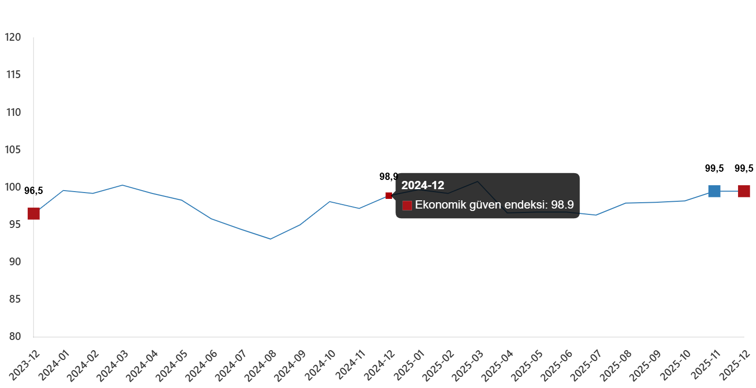 Ekonomik güven endeksi Aralık ayında aynı düzeyde kalarak 99,5 değerini aldı.