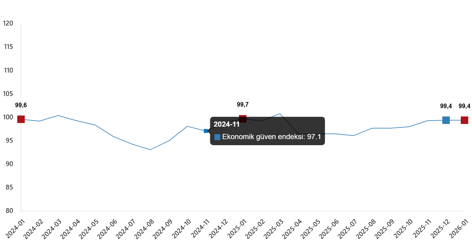 Ekonomik güven endeksi Ocak ayında aynı düzeyde kalarak 99,4 değerini aldı.
