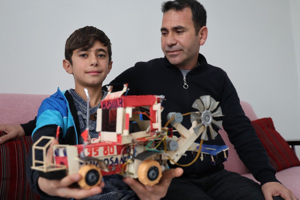 Selçuk Bayraktar’ı yakından takip ettiğini belirten Selçuk, “Ben 12 yaşındayım. Babamın yaptığı şeyleri görerek başladım. Babamın verdiği harçlıklarla gidip çubuk ve yapıştırıcı alıyorum. Babam da elektrik işi yapıyordu, ondan gördüm. Yaklaşık dört ay uğraştım. Küçük görünüyor olabilir ama benim için çok zor bir çalışmaydı.
