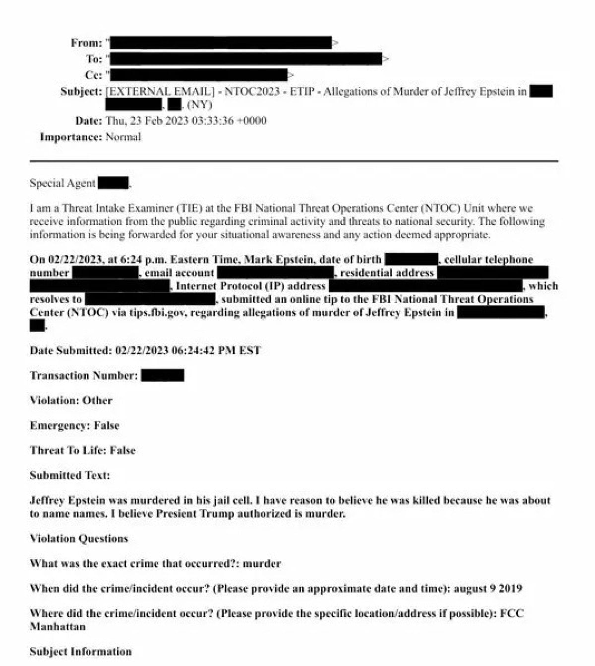 Mark Epstein’in 2023’te FBI’a gönderdiği bir ihbar da bulunuyor.