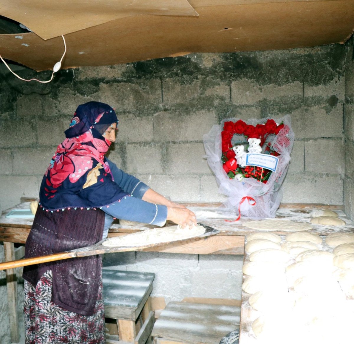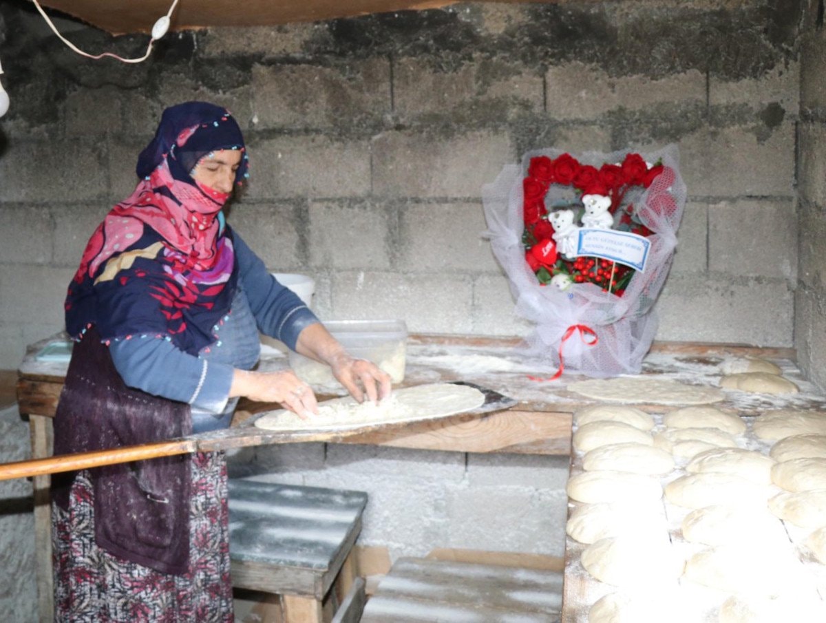 Kucağında çiçekle evinin yolunu tutan Abdullah Başar, eşini tandırda ekmek pişirirken buldu.