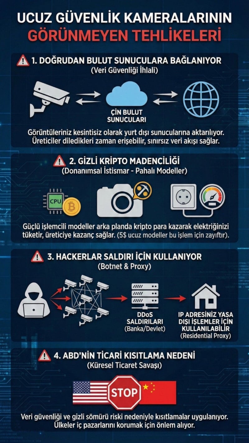 Gelişen teknolojiyle birlikte ev ve iş yerlerinde sıkça tercih edilen uygun fiyatlı güvenlik kameraları, aslında tahmin edilenden çok daha riskli.