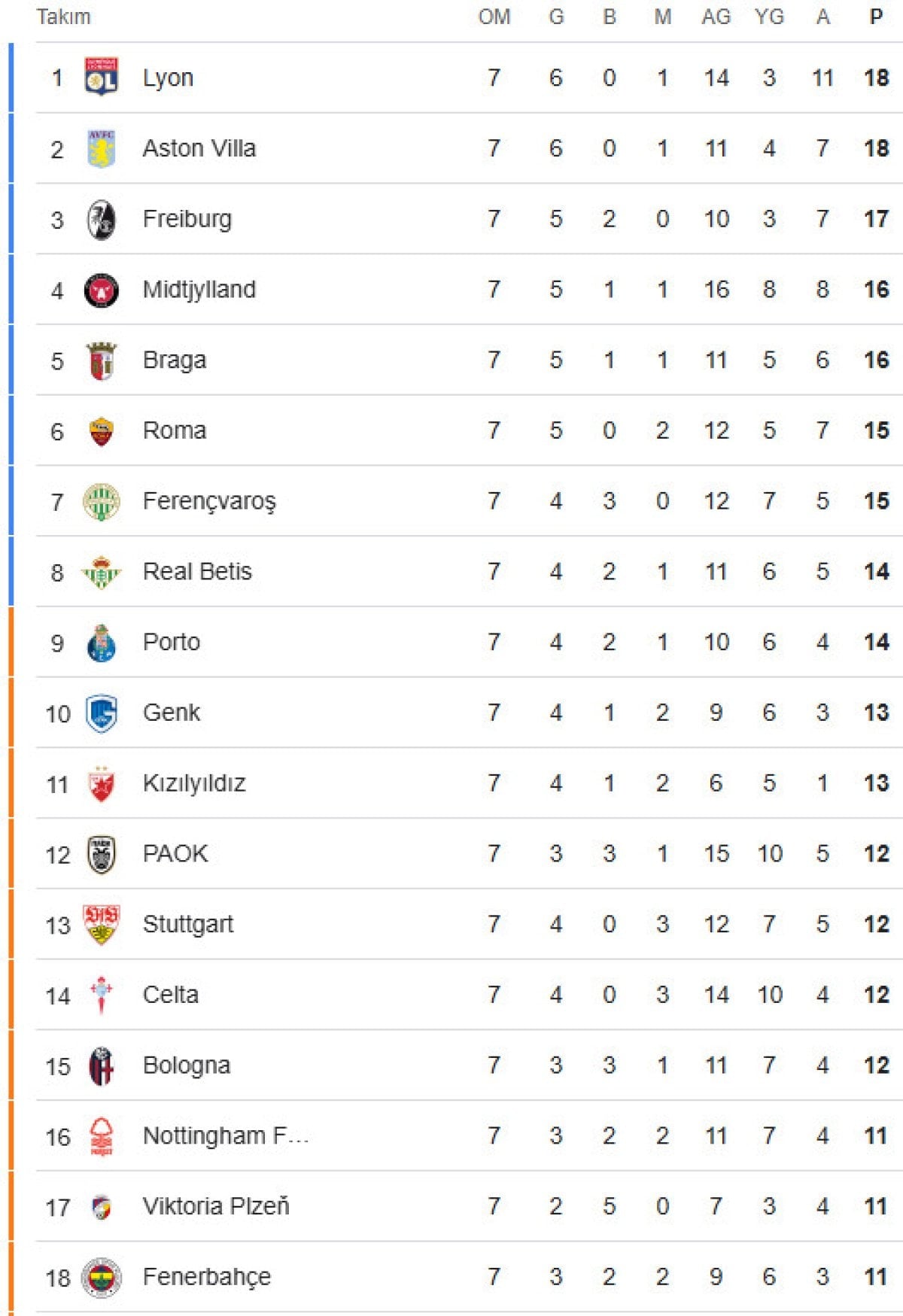 UEFA Avrupa Ligi’nin 7. haftasında Aston Villa’ya 1-0 mağlup olan Fenerbahçe’nin alınan sonuçların ardından ilk 24’e girmesi kesinleşti.